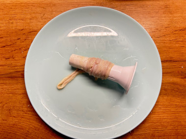 Промойте очищенную засоленную кишку как внутри, так и снаружи. Натяните на специальную насадку для набивки колбас или на срезанное горлышко пластиковой бутылки. Завяжите свободный конец кишки и проткните ее иглой, чтобы при набивке из нее выходил воздух.