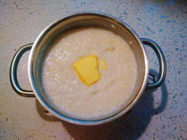 Сливочное масло я положила в самом конце. Еще немного добавила в тарелки при подаче. Каша вышла достаточно густая и в меру сладкая, муж очень любит такую. Ели ее с удовольствием!