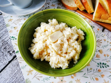 Готовую классическую рисовую кашу на молоке разложите по тарелкам. В каждую порцию добавьте кусочек сливочного масла. Когда она чуть постоит, становится более густой. Это можно поправить, разбавляя кашу кипятком или горячим молоком.