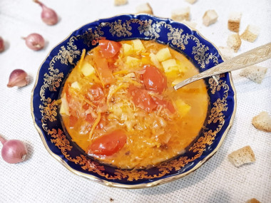 Простой и лёгкий способ приготовления обеда по рецепту щи из квашеной капусты в мультиварке. Готовила без мяса, на воде. В мультиварке на режиме *выпечка* спассеровала лук, морковь, добавила свежие помидоры и слегка все протушила. Затем по совету автора рецепта одновременно заложила в чашу мультиварки