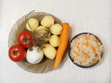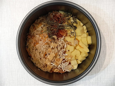 квашеную капусту, картошку, сушеные корни сельдерея и петрушки, зонтик укропа, сушеный чеснок и специи по вкусу.
