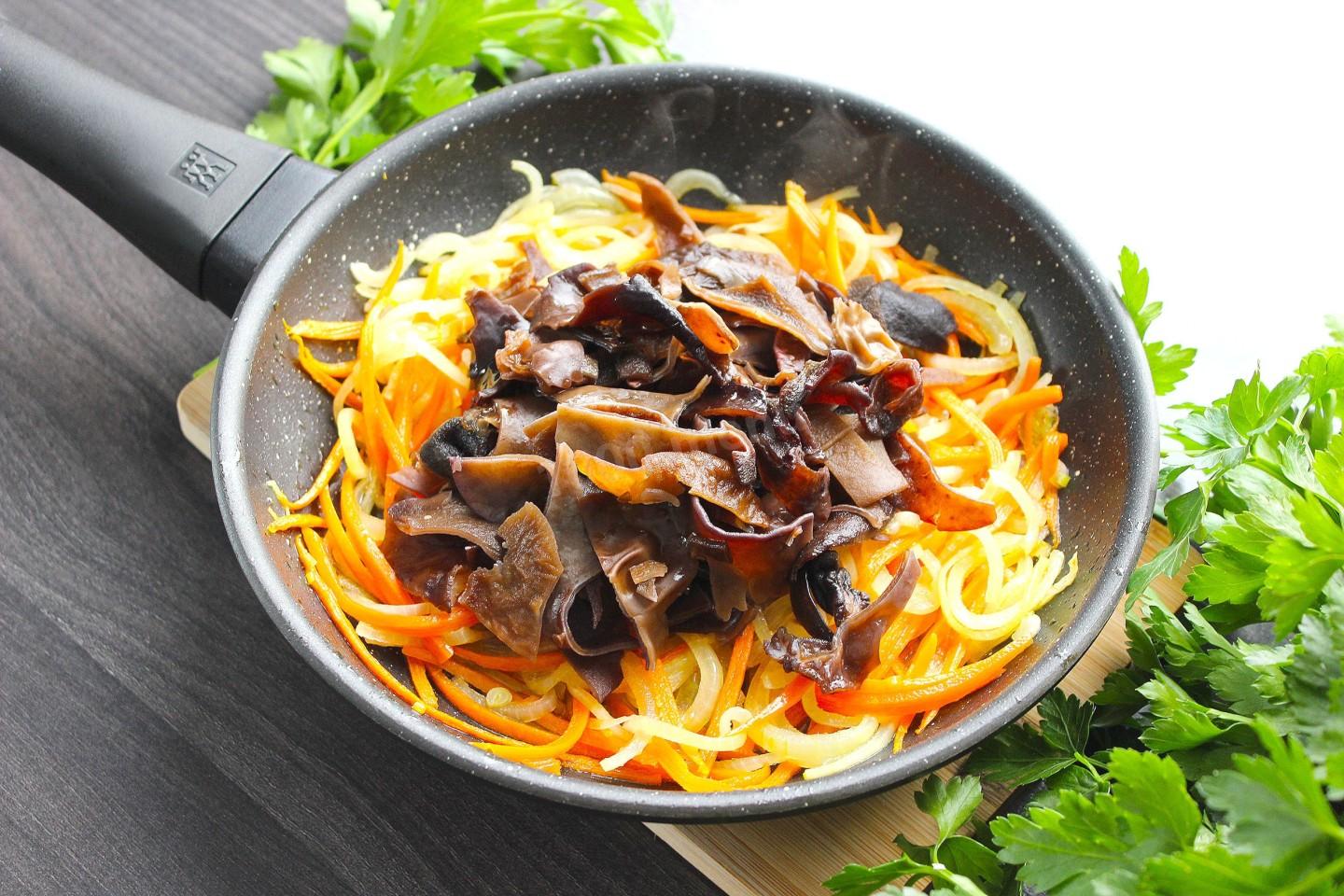 Отправьте древесные грибы к овощам и обжаривайте всё вместе 3-5 минут.Шаг 9. Как смешать фунчозу с зажаркой?