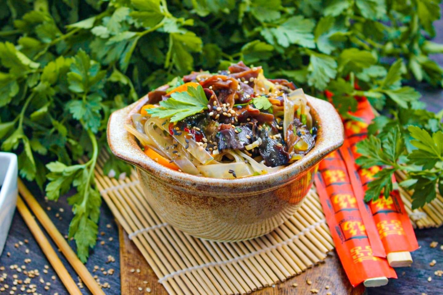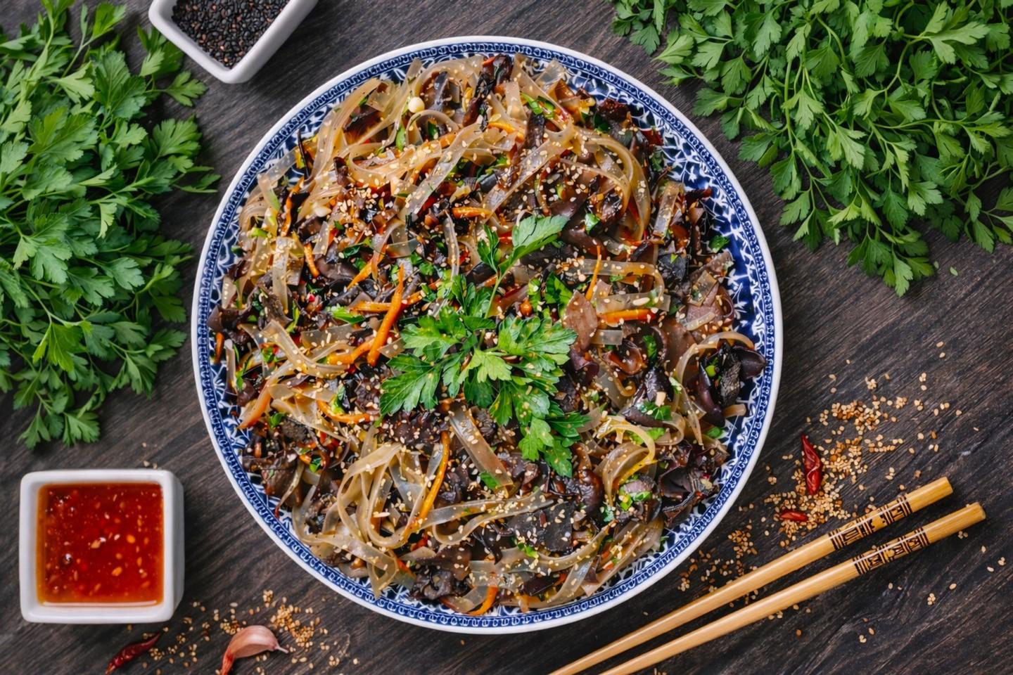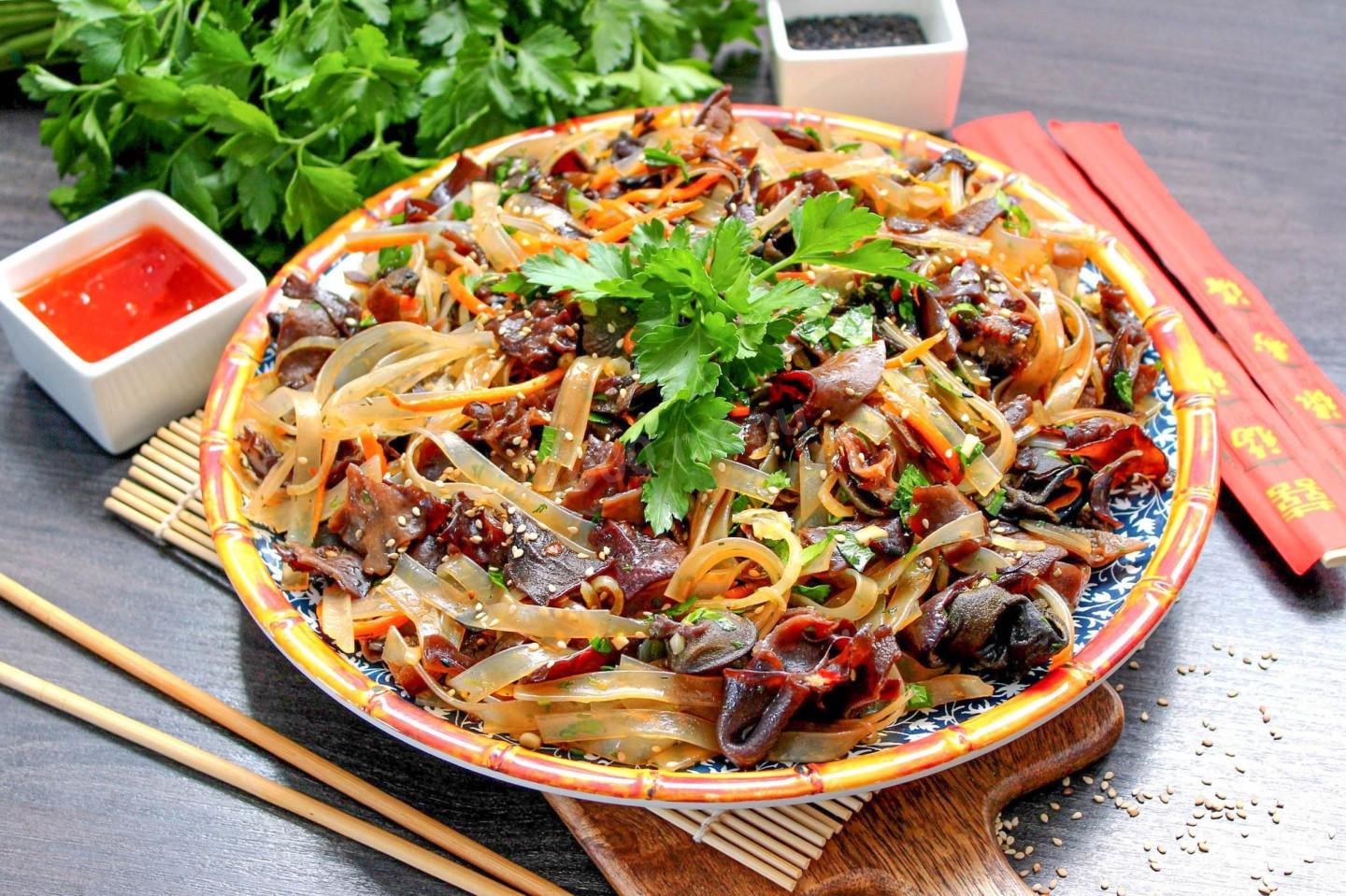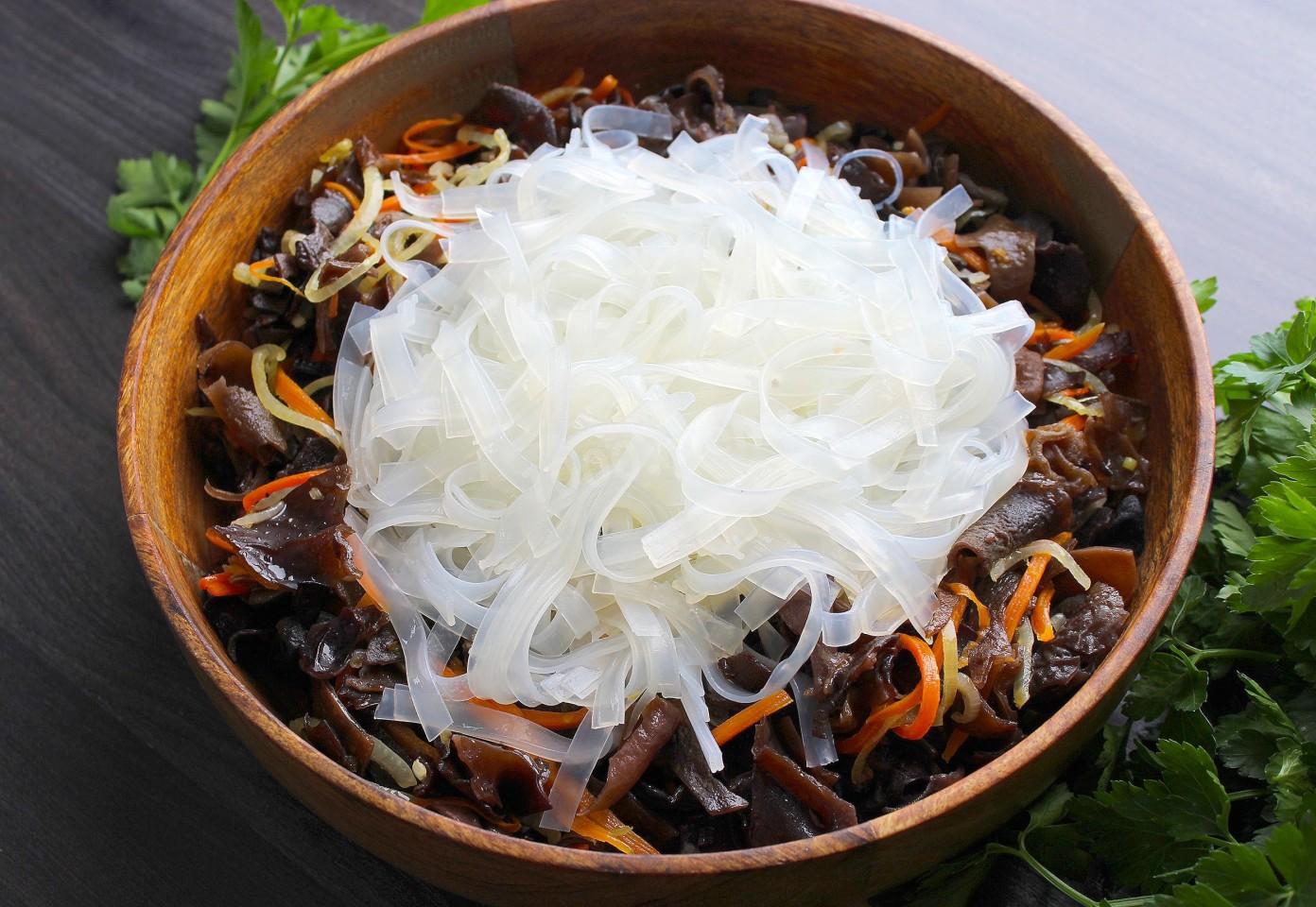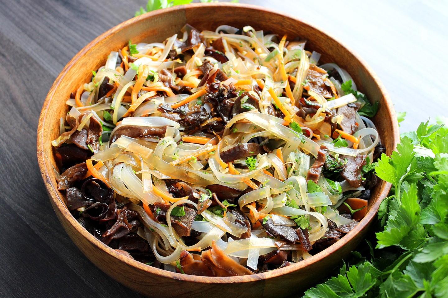 Салат с древесными грибами и фунчозой – это не только вкусно, но и полезно. Китайские древесные грибы (муэр) ценятся за высокое содержание железа и витаминов группы B. Они низкокалорийны, придают блюду характерный хруст и помогают очищать организм. В сочетании с легкой стеклянной лапшой и обжаренными овощами получается сбалансированное блюдо, которое дарит энергию и отлично усваивается.