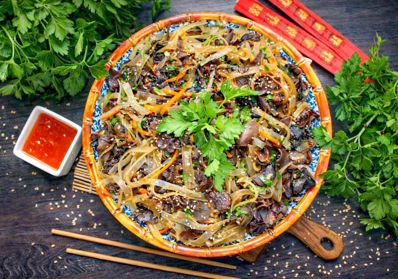 Как дополнение: этот салат из фунчозы станет отличным гарниром к жареной свинине в кисло-сладком соусе или курице в устричном соусе.