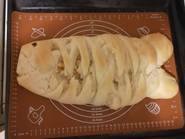 Таким образом заверните все полоски теста. Начинка должна быть полностью ими закрыта.