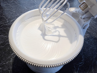 - яичные белки взбиваем с сахаром до пышных устойчивых пиков;