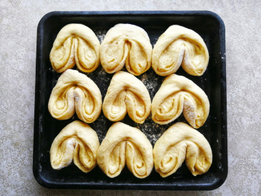 Разделила его на 9 частей. Каждую часть раскатала, сделав 9 лепешечек. Смазала их растительным маслом - по 1 чайной ложке на каждую. Посыпала сахаром. Ушло также по 1 чайной ложке на штучку. Сформировала плюшки сердечки, посыпала их сверху сахаром для большей сладости.