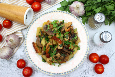 Как потушить картошку с мясом и грибами? Подготовьте ингредиенты. Вместо свинины можно взять говядину, курицу, индейку. Очень вкусно получится с кроликом. Грибы также подойдут любые — шампиньоны, как у меня, вешенки, лесные.