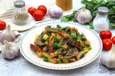 Рецепт отличный: вкусно, быстро, просто, по-домашнему! У меня были замороженные нарезанные шампиньоны, поэтому я их обжарила на отдельной сковородке, а дальше следовала рецепту. Правда, я немного изменила пропорции, все-таки люблю, когда мяса немного поменьше, но это скорее дело вкуса. Мне кажется, что очень вкусно должно получится с лесными грибочками, но это, конечно, в сезон, а пока и с шампиньонами на ура заходит.