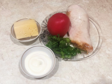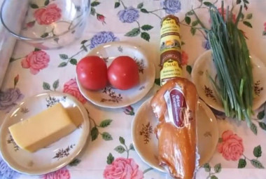 Как сделать салат с копчёной курицей и помидорами? Очень просто! Подготовьте все необходимые ингредиенты.