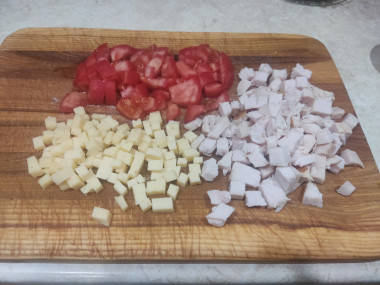 У меня была копчёная грудка,которую я порезала кубиками. Помидорку я порезала обычную,не черри. Сыр также порезала кубиками. Смешала ингредиенты,добавила