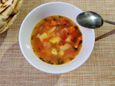 Налейте к овощам и крупе 700 мл. кипятка, всё хорошо перемешайте и попробуйте на соль. Если требуется, то досолите по вкусу. После закипания плиту убавьте до среднего и готовьте суп под полузакрытой крышкой до полной готовности картофеля и остальных компонентов. У меня на это ушло примерно 20 минут.