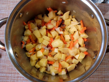 В кастрюле с толстым дном или в небольшом казанке разогрейте растительное масло. При сильном огне отправьте морковку, перец и лук обжариваться. Периодически помешивая овощи, готовьте их около пяти минут.