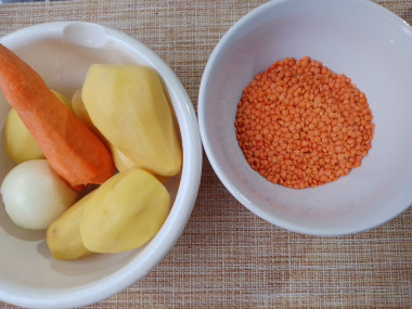 Картофель, лук, морковку и чеснок почистите. У болгарского перца удалите плодоножку и семена. Для яркости готового супчика можно использовать перцы разных цветов. Чечевицу промойте несколько раз в воде.