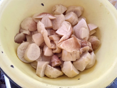 Затем очищенные грибы нарезаем крупно, небольшие грибочки можно оставить целыми или разрезать просто пополам.