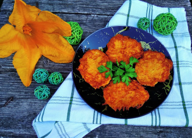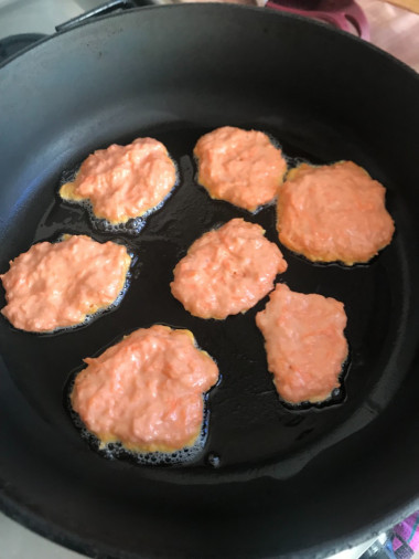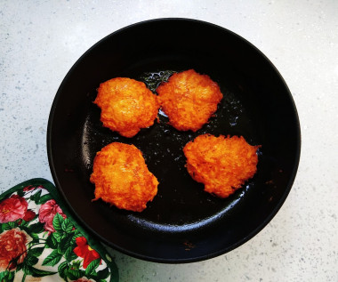 В сковороде на среднем огне разогрейте растительное масло. Выкладывайте морковное тесто ложкой, формируя оладьи. Обжарьте их как обычные оладьи, до золотистой корочки с двух сторон. Готовые оладьи выложите на тарелку с бумажным полотенцем, чтобы впитался лишний жир. Подавайте оладьи горячими, вкуснее всего они сочетаются с медом и со сметаной. Приятного аппетита!