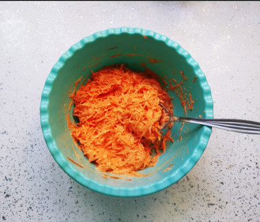 Всыпьте в тесто тертую морковь и перемешайте массу до однородности. Удобнее это сделать ложкой, а не венчиком. Если вы увидите, что тесто получается слишком густым, добавьте в него столовую ложку сметаны.