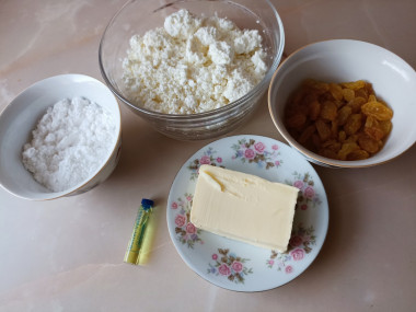 Как сделать творог с изюмом? Подготовьте продукты. Творог возьмите вкусный, качественный, не выбирайте творожный продукт с растительными добавками — блюдо получится вкусным именно с натуральным творогом. Жирность в принципе не имеет значения, от нее будет зависеть лишь калорийность блюда. У меня творог 5%. Сливочное масло достаньте из холодильника заранее, оно должно стать мягким. Изюм возьмите без косточек, темный.