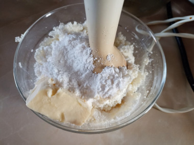 Добавьте к творогу мягкое сливочное масло. Оно должно быть именно мягким, чтобы его можно было легко взбить миксером. Всыпьте сахарную пудру. Количество пудры регулируйте по своему вкусу. Можете положить меньше — творог с 4 ложами получается очень сладким. Используйте именно пудру, а не сахар, так как сахар не успеет раствориться при взбивании. Всыпьте щепотку ванилина. О том, как использовать ванилин, читайте в статье в конце рецепта.