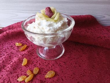 Масса готова. Она очень нежная и мягкая. Храните ее в контейнере в холодильнике. После холода мягкий творог с изюмом становится намного гуще. Срок хранения такого творога — не больше 3 суток.