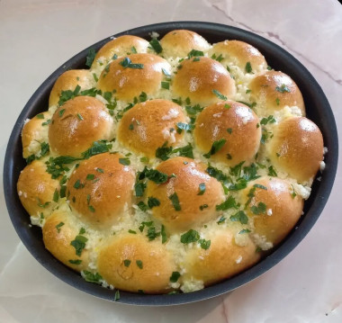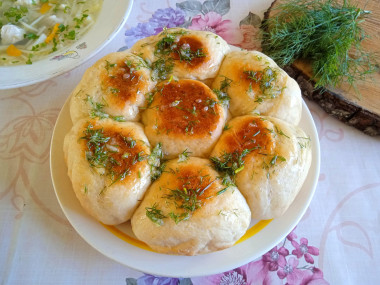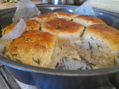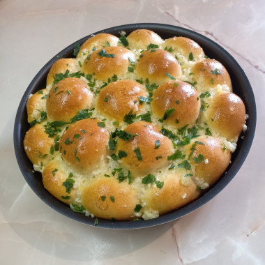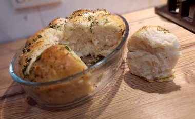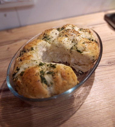 Какой же борщ без пампушек, да ещё и с чесночком?! Увидела рецепт "чесночные пампушки к борщу за 20 минут" и решила приготовить. Все продукты были под рукой, заменила только свежие дрожжи на сухие. Уменьшила количество продуктов в два раза, так как готовила в мультиварке в чаше диаметром 22 см. Смешала все ингредиенты и вымесила эластичное тесто. Сначала оставила тесто в миске в тепле на пол часа. После сделала шарики и уложила в чашу мультиварки, выстелив пергаментом. Тесто через 15 минут хорошо подошло. Выпекала пампушки полчаса в режиме "выпечка". Для заправки смешала масло, соль, укроп и чеснок. Горячие пампушки полила заправкой и дала им остыть.