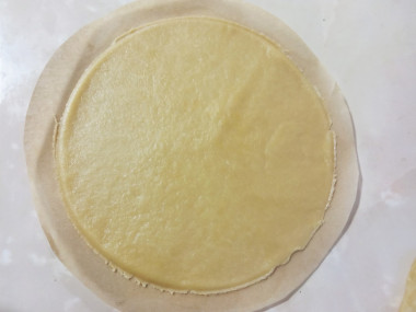 Каждую часть теста раскатайте в тонкий пласт толщиной около 2 мм. Делать это лучше сразу на пергаменте, поскольку тесто очень нежное и без пергамента перенести его на противень практически невозможно, тесто будет рваться. Пергамент лучше выбирать силиконизированный, с него проще снимать готовые коржи.