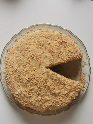 Я обсыпала торт сверху медовой крошкой. Поставьте торт в холодильник на 10-12 часов, чтобы он хорошо пропитался. Теперь можно убрать пергамент с тарелки. Перед подачей украсьте торт по желанию.