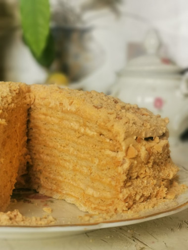 Торт медовик классический со сгущенкой и маслом остаётся одним из самых популярных и любимых для многих. Для крема взяла натуральное сливочное масло и натуральное сгущённое молоко без добавления растительных жиров. Крем получился очень вкусный! Коржи раскатывала и выпекала на силиконизированном пергаменте. У меня тоже получилось девять коржей, диаметром 20 см. После остывания промазала коржи кремом, Бока и верх медовика обсыпала крошкой из печенья , с небольшим добавлением порошка какао. В холодильнике торт провел часов 16. На следующий день поехали в гости с этим тортом. Чаепитие удалось на славу! Равнодушных не осталось, медовик понравился и детям и взрослым. Спасибо автору за рецепт!