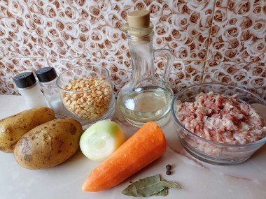 Как сварить гороховый суп с фрикадельками? Сначала подготовьте ингредиенты. Горох промойте несколько раз, пока вода не станет прозрачной. После этого залейте горох водой и оставьте примерно на два часа. За это время он немного набухнет. Затем слейте воду, переложите горох в кастрюлю, залейте чистой водой и поставьте на огонь. С выбором кастрюли для супа поможет статья по ссылке в конце рецепта.