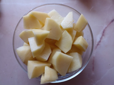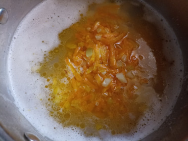 Когда вода с горохом в кастрюле закипит, добавьте туда картофель и овощную зажарку и варите после закипания примерно 15-20 минут на слабом огне.