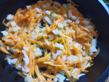 Очистите лук и морковь. Мелко нарежьте лук, натрите морковь на крупной терке. Разогрейте на сковороде растительное масло, положите туда лук и морковь и обжарьте до легкого румяного оттенка, помешивая. Почистите и помойте картофель, нарежьте его маленькими кубиками. Посолите и поперчите фарш по вкусу. Фарш можно использовать как готовый покупной, так и сделанный самостоятельно. У меня уже готовые замороженные фрикадельки (из свинины и говядины.)