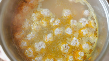 Потом чайной ложкой зачерпните фарш и осторожно опустите шарики в кипящий бульон, постоянно помешивайте, чтобы фрикадельки не прилипли ко дну кастрюли.