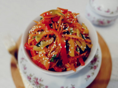 В данном случае это болгарский перец! Он вносит значительную сочность и красиво дополняет морковь. Особо хочется отметить кунжут, продукт богатый кальцием, поэтому не пренебрегайте им и добавляйте по мере возможности.