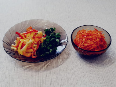 Вкусный и яркий салат с болгарским перцем и корейской морковью получился при добавлении дополнительных ингредиентов (сладкий перец, петрушка, соевый соус) к уже готовому салату моркови по корейски, который я заранее приготовила по этому рецепту. Салат очень понравился, его можно быстро приготовить как дополнение к обеду, а можно и как основное блюдо на гарнир.