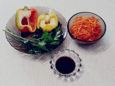 Подготовьте продукты необходимые для приготовления салата: морковь по-корейски, сладкий болгарский перец, немного соевого соуса, свежую петрушку, белый кунжут.