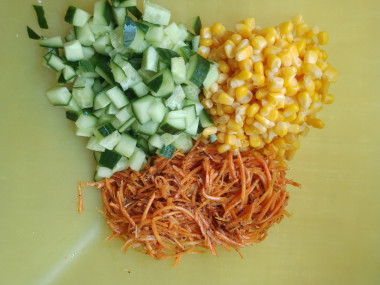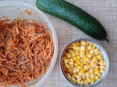 Как сделать салат с корейской морковью, огурцом и кукурузой? Подготовьте продукты, которые потребуются для приготовления салата: морковь по-корейски, консервированную кукурузу, свежие огурцы, немного свежей зелени. Также необходимо немного растительного масла и соли по вкусу.