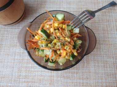 Пикантный, с пряными нотками - на праздник и каждый день! Салат с корейской морковью, огурцом и кукурузой - это лаконичное сочетание продуктов, которые хорошо гармонируют между собой. Для него достаточно растительного масла (оливкового или кунжутного) и соли, но можно добавить сока лимона и свежей зелени.
