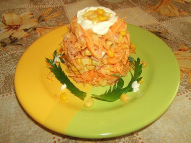 Салат с корейской морковью и кукурузой любит мужская половина нашей семьи. Все просят поострее, поэтому заправила майонезом. Вкусно и сытно, спасибо!