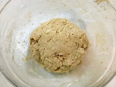 Просейте муку с разрыхлителем и добавьте к жидким ингредиентам. Замесите густое мягкое тесто, из которого можно сформировать шар. В зависимости от качества муки её может понадобиться чуть больше или меньше. О муке и её свойствах подробнее можно прочитать в отдельной статье, ссылка в конце рецепта. Оставьте тесто на 15 минут для «отдыха». За это время в муке разовьется клейковина, и тесто получится эластичнее и податливее. Выложите пергамент на противень.