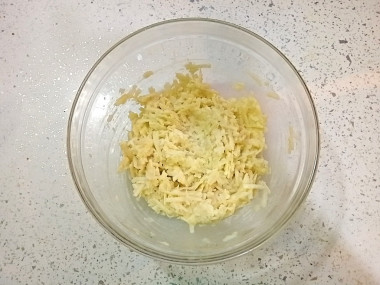 Взбейте венчиком или миксером на небольшой скорости куриное яйцо с щепоткой соли. Когда масса немного вспенится, добавьте сахар и снова взбейте. Натрите на крупной тёрке сливочное масло и добавьте его в яично-сахарную смесь. Хорошо всё перемешайте.