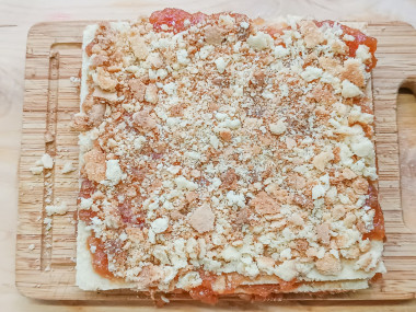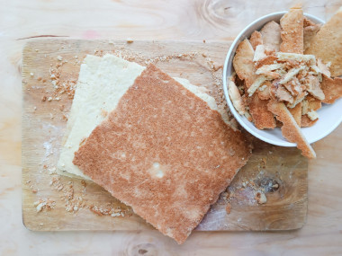 Достаньте готовые коржи, дайте им немного остыть, неровные края обрежьте. Отрезки теста перетрите в крошку, это можно сделать просто руками, тесто очень мягкое. Также для этого можно использовать скалку или блендер. Отставьте крошки в сторону, они понадобятся чуть позже при обсыпки торта.