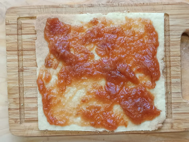 Замесите тесто. Второй секрет удачного песочного теста, его нельзя долго месить, иначе оно будет тугое и не вкусное. Оберните тесто в пищевую пленку и уберите на полчаса в холодильник. Тем временем достаньте любимый джем. У меня сливовый. Лучше брать однородный по консистенции и погуще.