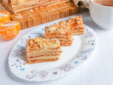 Торт получился очень вкусный. При нарезании не крошится. Коржи остались хрустящими, но при этом они не жесткие.