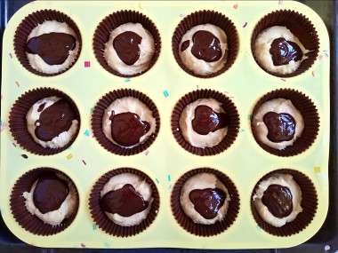 Разлить тесто в смазанные маслом формочки для кексов. В центр выложить по 2-3 ст. л. шоколадного ганаша.