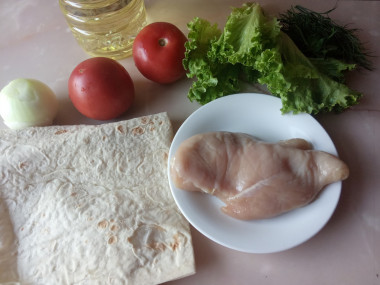 На рабочей поверхности разверните лист лаваша. Лаваш предварительно промажьте соком от мяса. На край лаваша выложите дорожкой зелень, помидор, лук и поджаренное мясо.