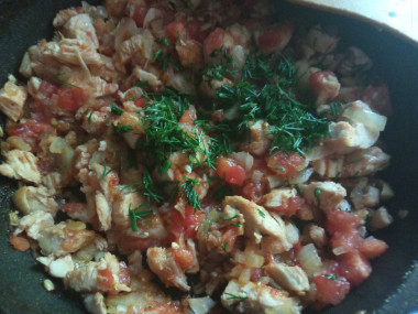 Помидоры помойте, обсушите, вырежьте места крепления плодоножки, нарежьте мелкими кубиками. Репчатый лук так же очистите от шелухи, порежьте полукольцами или четвертинками колец. Зелень помойте под проточной водой, обсушите, измельчите острым ножом.