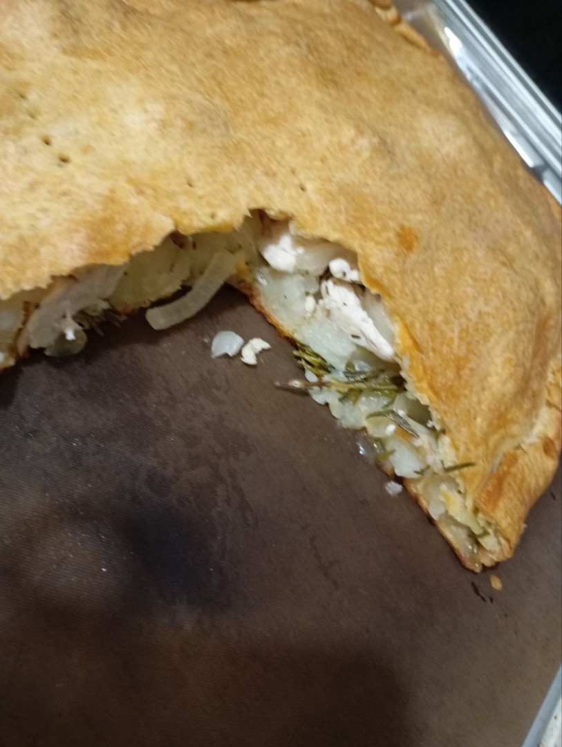 • Равномерно распределяем по всей основе картошку, затем курицу, солим, лук выкладываем сверху.