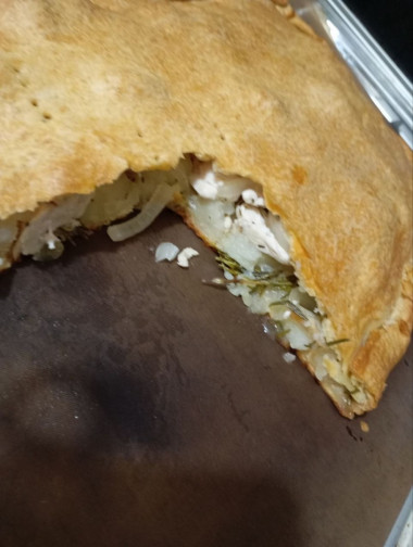 • Накрываем начинку вторым листом теста. И по всей поверхности протыкаем вилкой, чтобы тесто при выпекании не поднималось волнами.