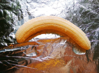 Все то же самое можно проделать, не извлекая бананы из кожуры. Достаточно только разрезать кожуру по внутренней вогнутой стороне вдоль всего плода и слегка отогнуть ее, чтобы между кожурой и мякотью было небольшое пространство.