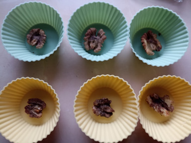 Итак, как только масса загустела, выложите ее в форму, сверху положите орехи, немного вдавливая их. Уберите форму в холодильник на пару часов. Когда это время пройдет, достаньте форму и нарежьте лакомство на кусочки.